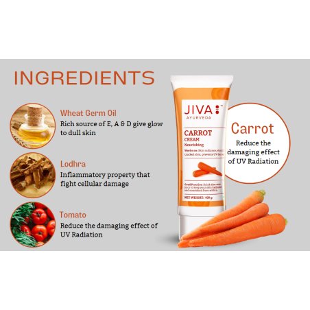 Morkų veido kremas - prabangus veido kremas giliai maitina jūsų odą. Šis kremas, pagamintas iš natūralių žolelių ekstrakto ir aliejaus, tinka naudoti visų tipų odai, jame nėra parabenų ir silikono. Jame yra žolelių ir natūralių veikliųjų medžiagų: morkų, kviečių gemalų, pomidorų, baltųjų lelijų, saulėgrąžų, dygminų ir Lodhra, kurios giliai maitina Jūsų odą. Formuojantis morkų poveikis yra epidermio ląstelėms. Taip pat natūraliai sumažina žalingą UV spindulių poveikį. Kviečių gemalų aliejus yra vienas turtingiausių vitamino E, A ir D šaltinių, jame taip pat yra daug baltymų ir lecitino. Sugrąžina odai lygų švytėjimą ir elastingumą. Jame gausu likopeno, antioksidantų, esančių pomidoruose, jis gali atkurti pažeistą odą ir atkurti jos natūralų, sveiką spindesį. Dėl rūgščių ir sutraukiančių savybių jis yra puikus ingredientas žmonėms, turintiems riebią ir į spuogus linkusią odą.
