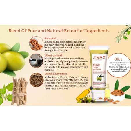 Alyvuogių veido kremas nuo raukšlių - turtingas natūralių ingredientų kremas nuo raukšlių padeda saugoti odą nuo priešlaikinio odos senėjimo. Alyvuogių aliejus, ashwagandha ir migdolų derinys sutraukia poras, atkuria odos elastingumą, pagerina odos tonusą. Ashwagandha padeda atjauninti ir regeneruoti ląsteles. Alyvuogių aliejus veikia kaip antioksidantas ir turi drėkinamąjį poveikį, apsaugo nuo laisvųjų radikalų žalos. Migdolų aliejus palieka odą švelnia ir nuolat drėkina.